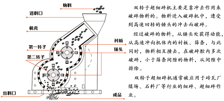 煤矸石制沙機(jī)工作時(shí),在雙電機(jī)的帶動(dòng)下,互相串連的兩套轉(zhuǎn)子同時(shí)高速旋轉(zhuǎn),物料在機(jī)內(nèi)腔經(jīng)上級(jí)轉(zhuǎn)子擊碎立即被飛速旋轉(zhuǎn)的下級(jí)轉(zhuǎn)子的錘頭再次細(xì)碎,內(nèi)腔物料相互飛速碰撞,相互粉碎,達(dá)到錘粉料,料粉料的效果,形成了出料粒度小于3毫米的煤渣顆粒。此顆粒度完全能夠滿足磚瓦廠家作為內(nèi)燃制磚的要求。